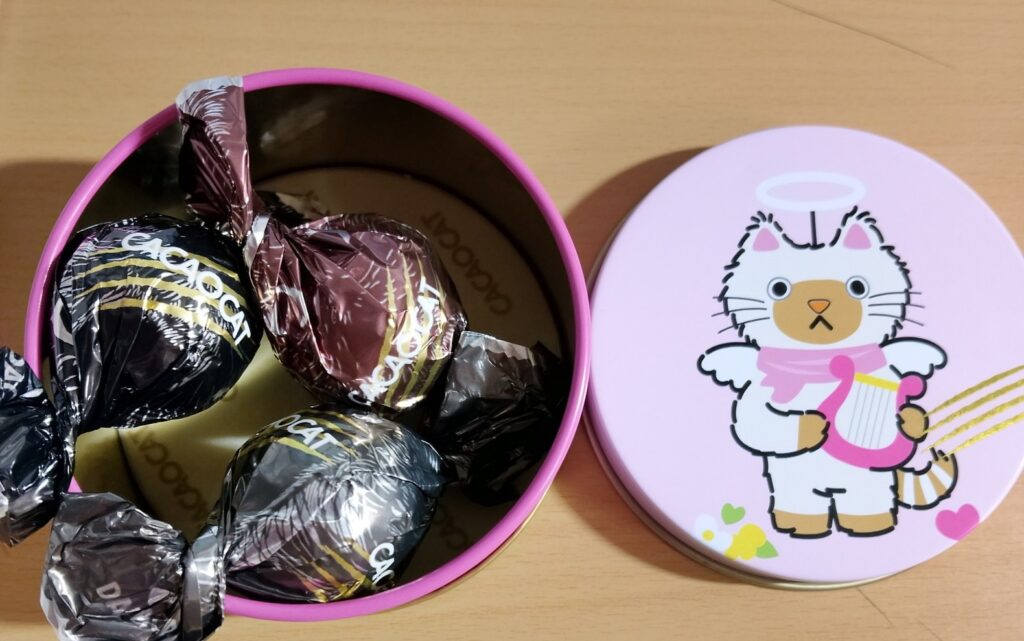 猫のイラストが入った可愛い缶に入ったチョコレートを発見。